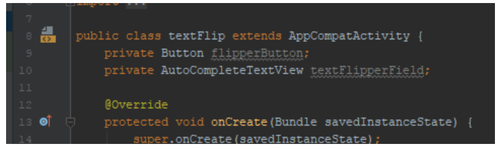 I toppen, før onCreate funktionen, men efter class, definerer vi to globale variabler, der kommer til at indeholde knappen og tekstfeltet.