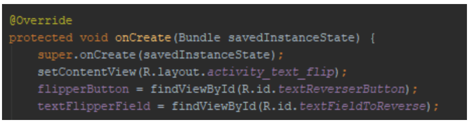 I onCreate funktionen, efter linjen, der starter medsetContentView, instantierer (opretter) vi se to variabler ved at bruge funktionen findViewById():