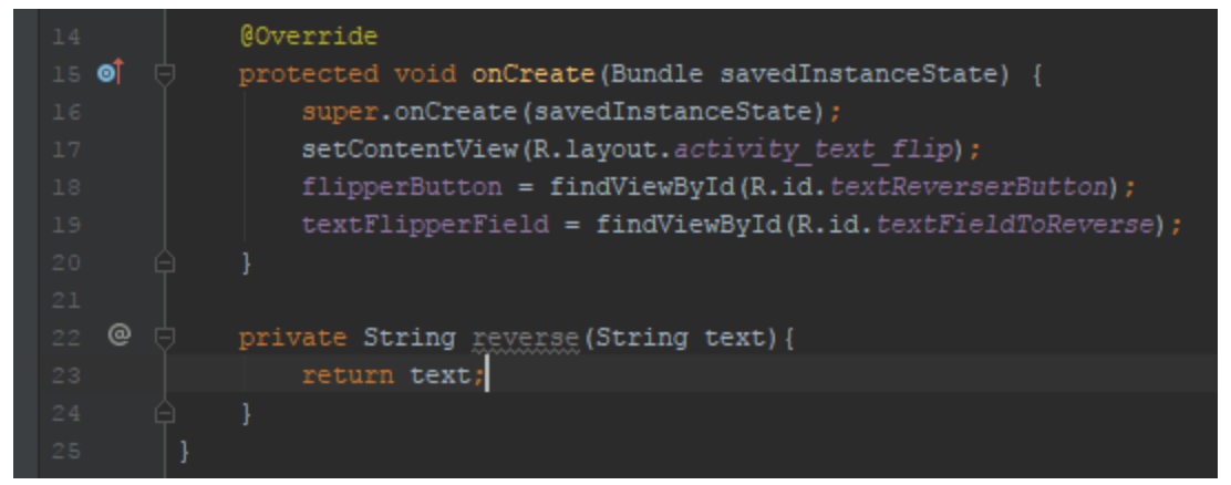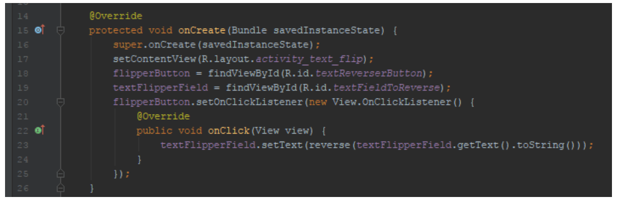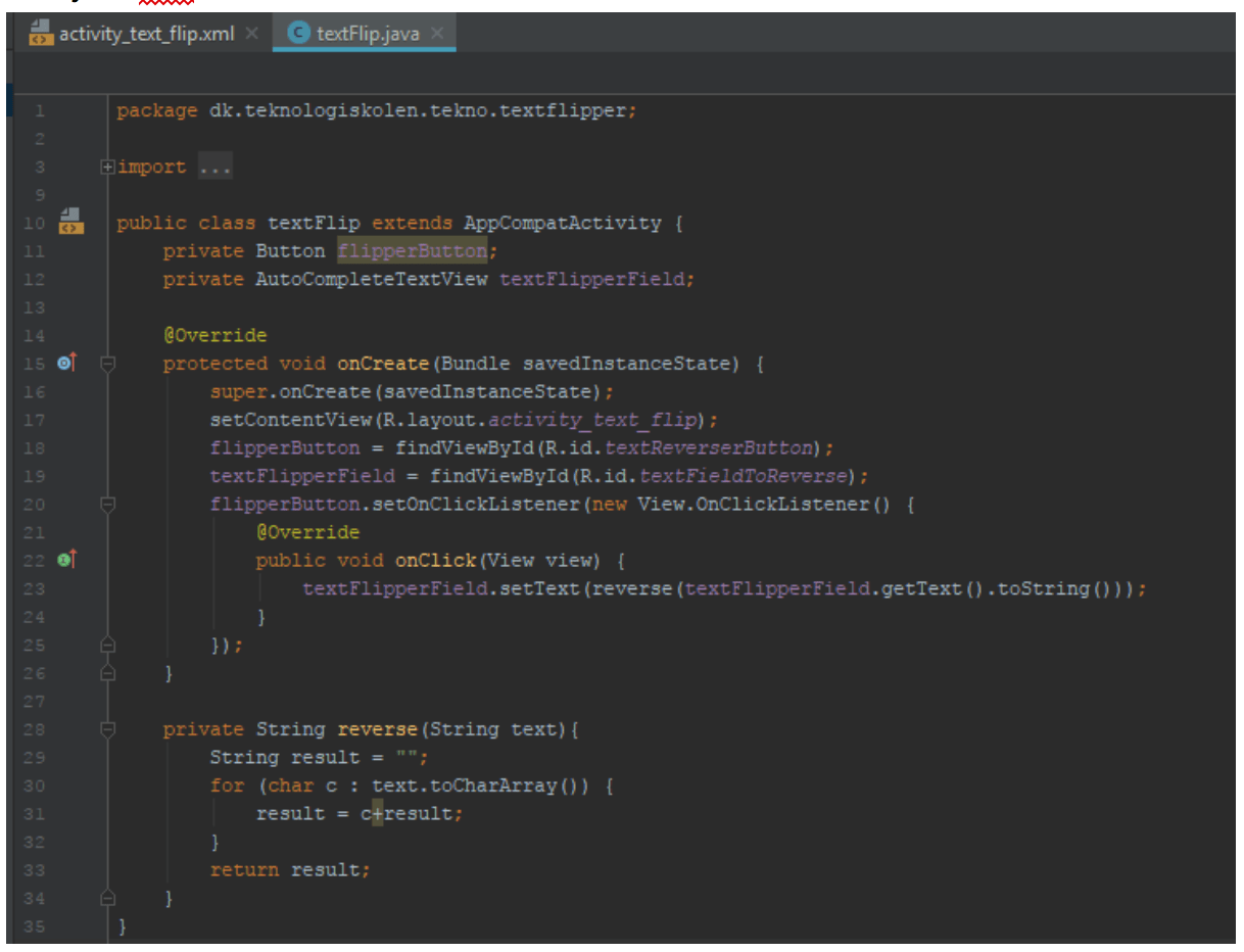 Hvis vi tygger os igennem linje 23, sætter den teksten i textFlipperField til at være resultatet af reverse funktionen med teksten fra textFlipperField (som String) som parameter.
