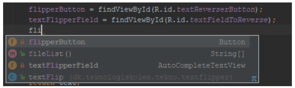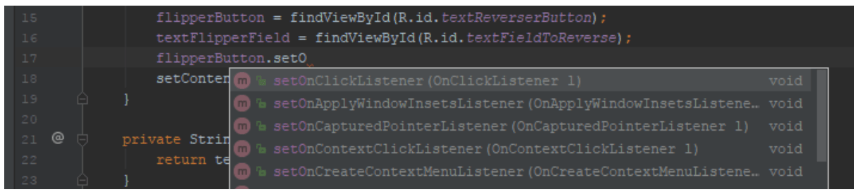 Skriv et punktum, og begynd at skrive setOnClickListener og tryk enter når den kommer frem i menuen: