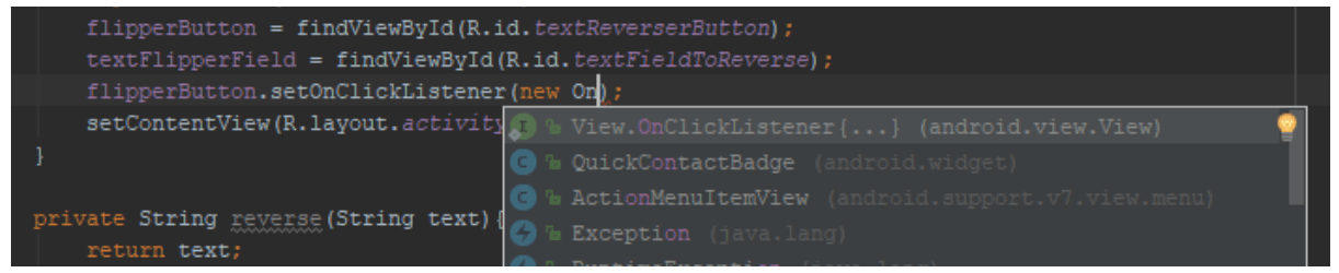 Herefter kan du begynde at skrive new OnClickListener, og følgende menu skulle vises: