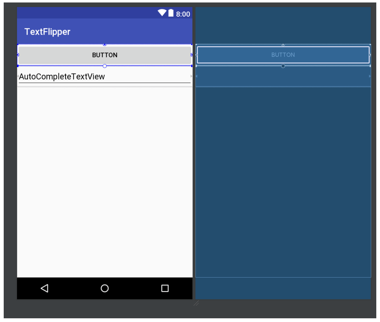 Herefter skal en knap og et tekstfelt tilføjes. Du kan selv beslutte hvilket tekstfelt, I eksemplet bruges et AutoCompleteTextView.